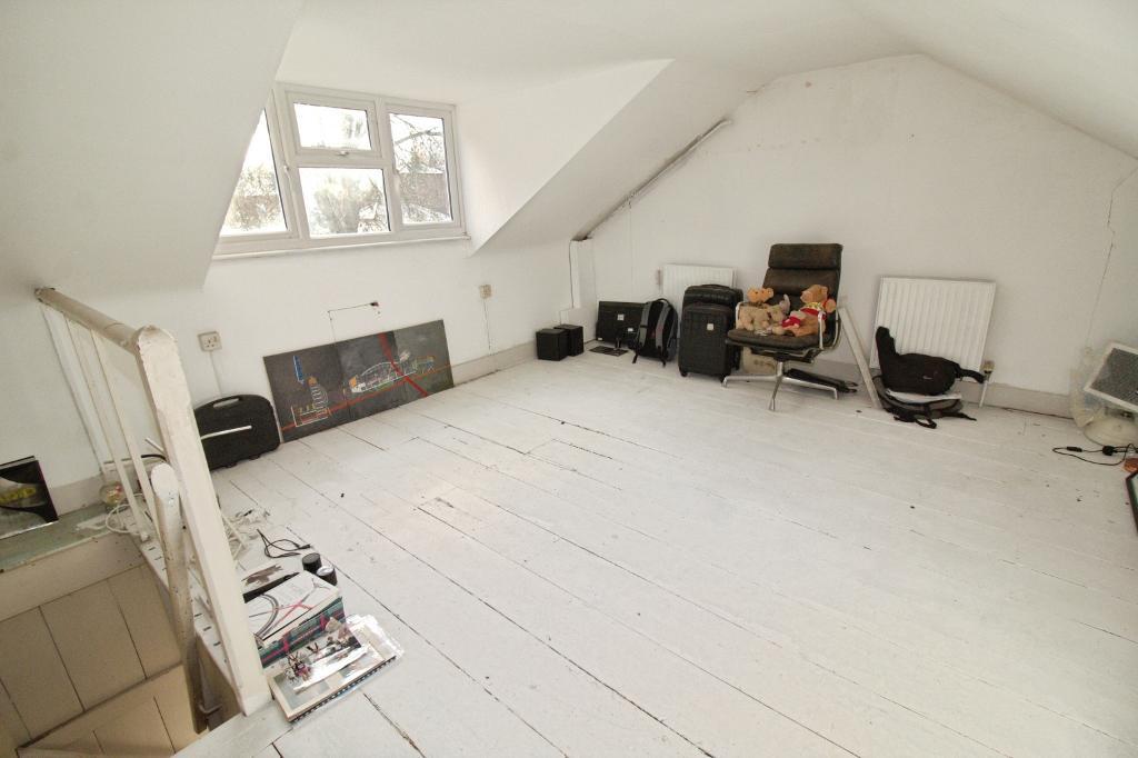 The property includes a reception room featuring large windows and a fireplace, creating a focal point for a future living space. The current bedroom is a double with a window to the front aspect. Additional accommodation is provided by a loft room and there is a cellar with ensuite facilities, offering flexible usage subject to refurbishment.