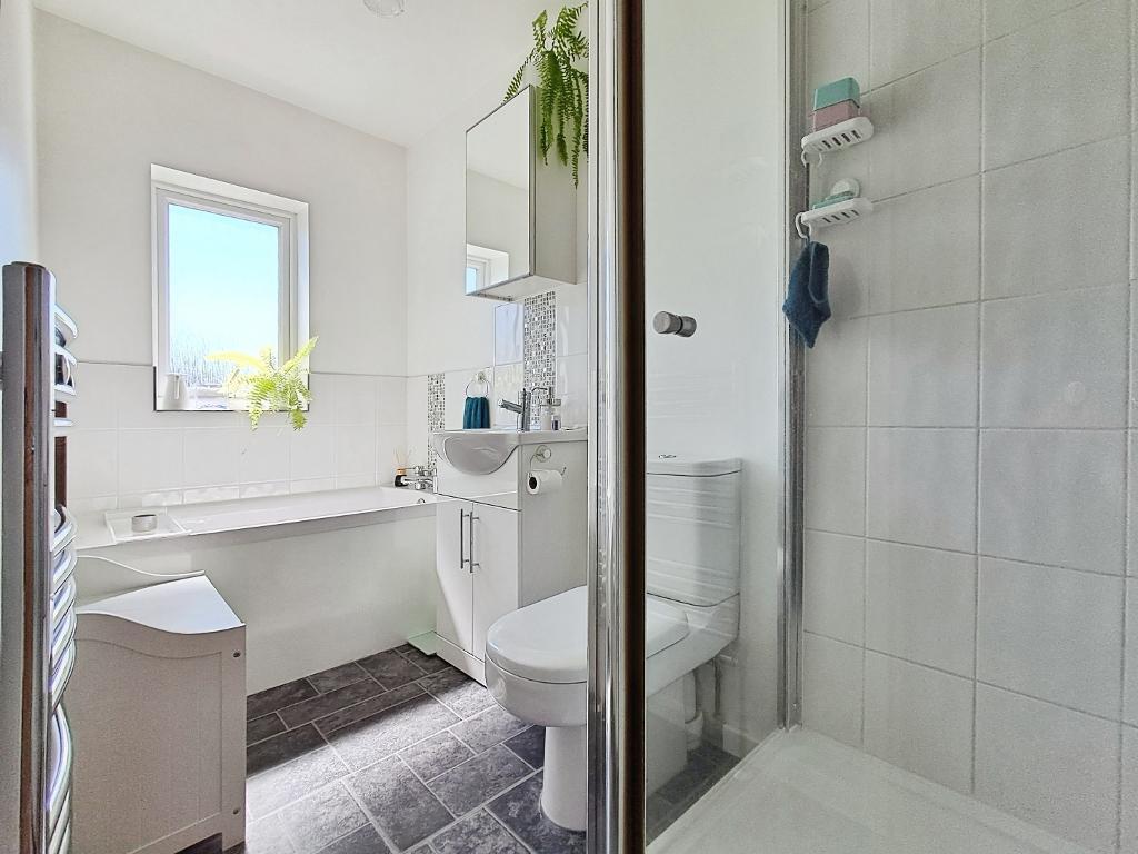 Upstairs, the landing benefits from useful built-in storage. The principal bedroom is a generously proportioned double with attractive flooring and a large window to the front aspect. The second bedroom is also well-sized and overlooks the rear garden. Completing the accommodation is a contemporary four-piece bathroom suite, comprising a low-level WC, vanity unit with wash basin, separate bath and shower, additional storage, and a heated towel rail for added comfort.