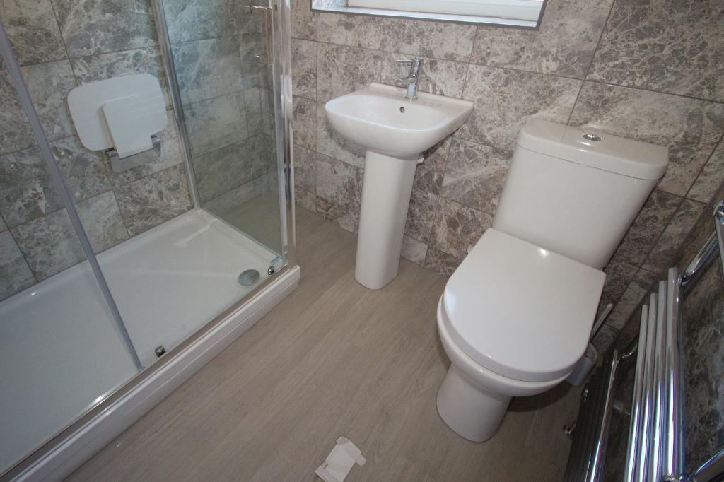 The bathroom is well-appointed with a heated towel rail, a shower cubicle, and tiled splashbacks.