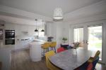 The open-plan kitchen is a modern delight with plenty of natural light. It features a stylish kitchen island, integrated modern appliances, and built-in pantries. The generous dining space is ideal for hosting family meals or dinner parties with friends.
