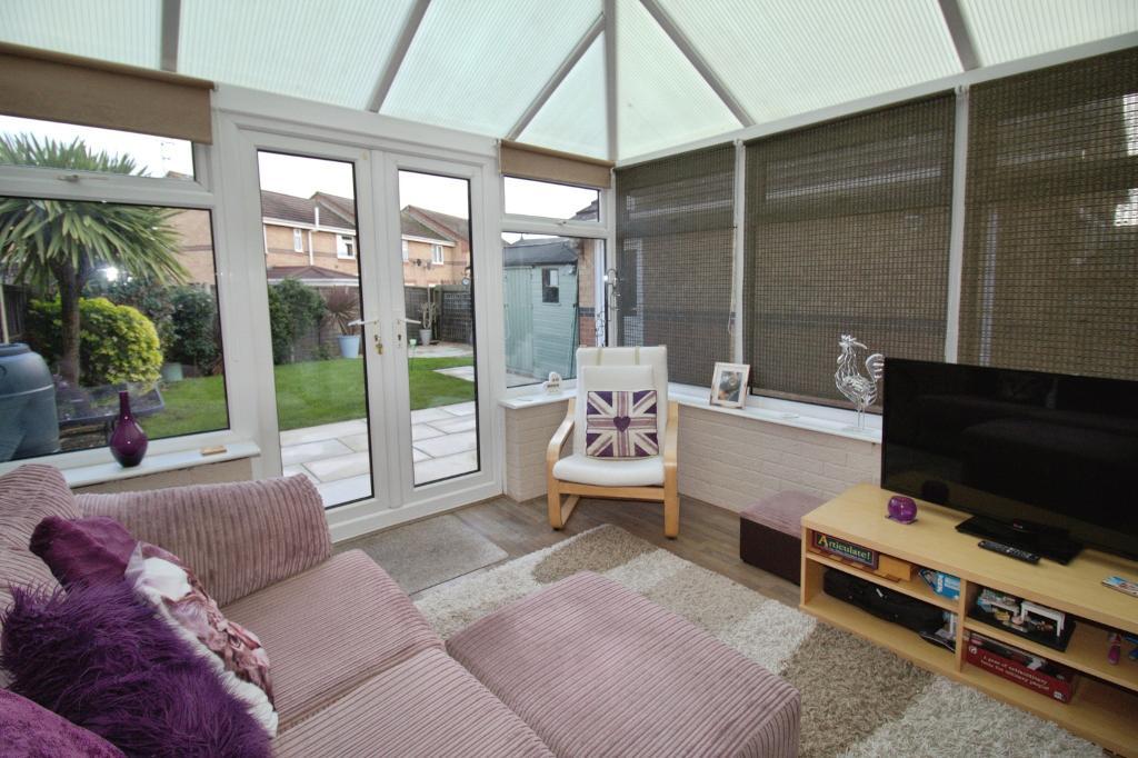 The well-appointed kitchen enjoys pleasant views over the garden and features a range of base-to-ceiling units, tiled splashbacks, a four-ring gas hob with chrome extractor hood, double oven, integrated dishwasher, stainless steel sink, and space for a washing machine. A useful side door provides direct access to the driveway. To the rear, a conservatory offers additional flexible living space ideal as a dining area, playroom or second sitting room with doors opening onto the garden.
