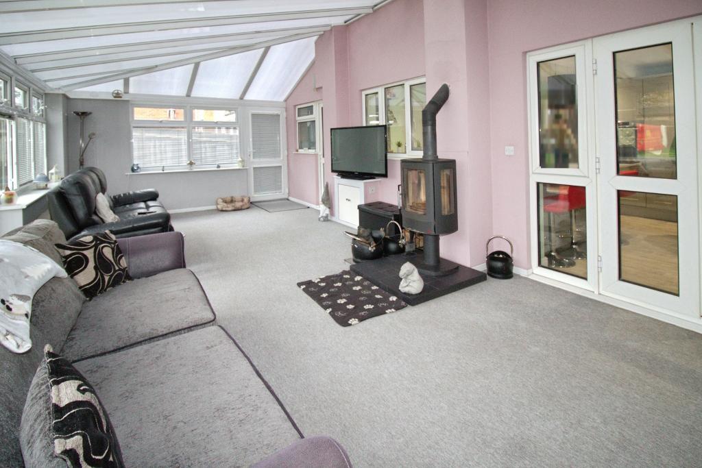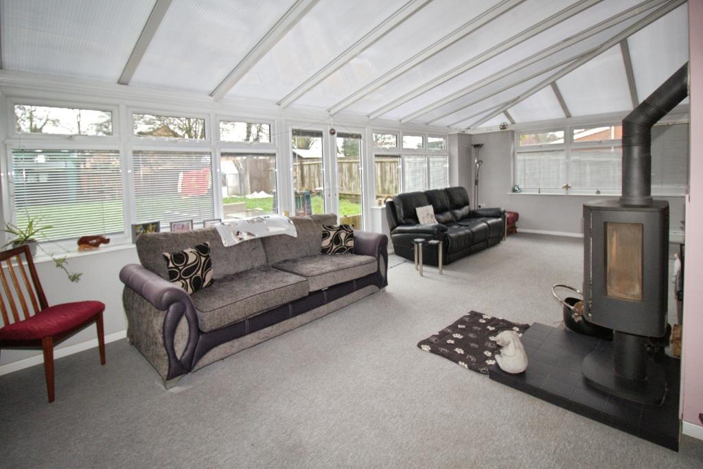 The elegant entrance hall, with its stylish wood flooring, provides an impressive first impression and leads into the heart of the home. Two generous reception rooms present both versatility and comfort the front room, with plush carpeting and large windows complete with fitted blinds, is perfect for relaxing evenings. At the rear, the second reception room enjoys open views and direct access to the expansive, sun-drenched south-facing garden. A multi-fuel burner set here sets the tone for cosy nights in.