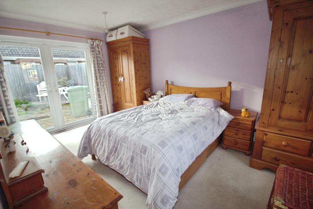 The property offers four double bedrooms. The main bedroom enjoys French doors opening onto the garden with views over the courtyard and carpeted flooring. Two further double bedrooms benefit from built-in wardrobes, fitted furniture and garden views, while the fourth double bedroom overlooks the courtyard and is also carpeted.